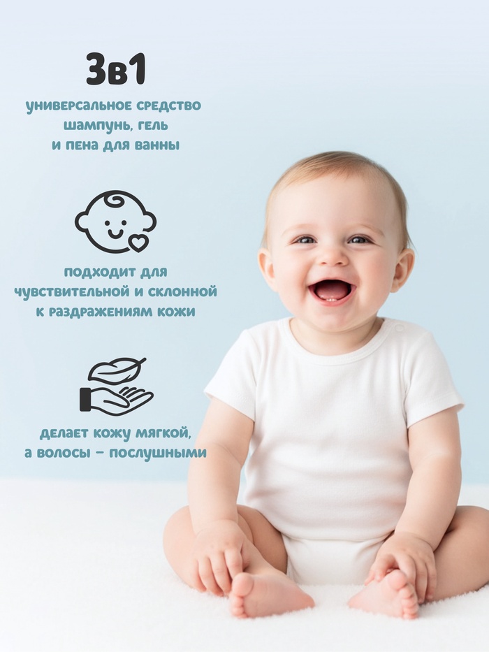 Не сожержит SLS, парабены, метилы, красители и аллергены. Бережное очищение от макушки до самых пяточек, а так же нежная пена для принятия вечерней ванны - все в одном флаконе.