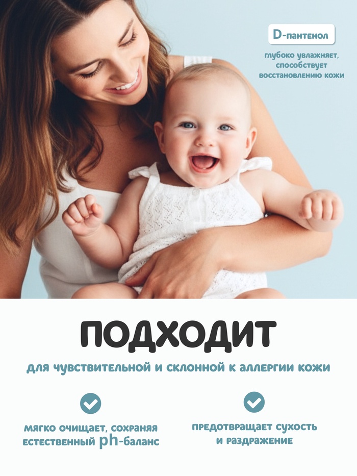 Нежная гипоаллергенная отдушка, входящая в его состав, подарит прекрасное настроение маме и малышу. Эргономичный флакон легко открывается одной рукой. Мы разработали комфортный и безопасный продукт, обогащенный натуральными экстрактами и активными компонентами, обеспечивающий мягкое очищение и уход.