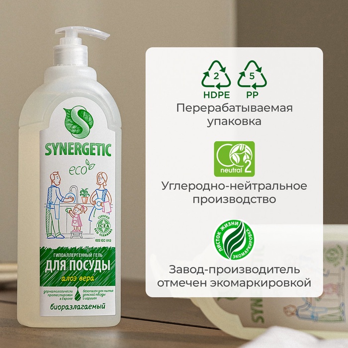 Средство для мытья посуды Synergetic, антибактериальный гель с алоэ вера, 1 л — чистота, безопасность и забота о коже