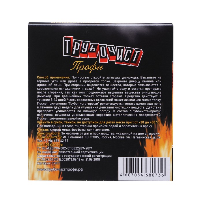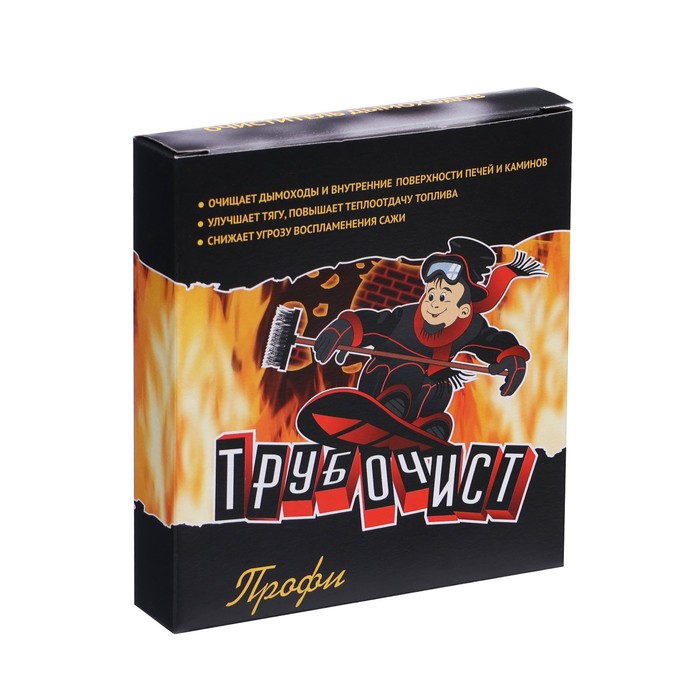 Очиститель от копоти и сажи «Трубочист профи» состоит из смеси специальных солей. Компоненты препарата в процессе горения дров действуют как катализаторы, выделяющие газы, которые вступают в реакцию со смолистыми отложениями и разрушают их структуру, улучшает тягу, повышает теплоотдачу топлива. Вследствие этого испаряется влага – основной компонент, обуславливающий твердость смолистого налета. Остаются лишь хрупкие остатки смолы, которые осыпаются, термически расщепляются и сгорают. Снижается угроза воспламенения сажи.