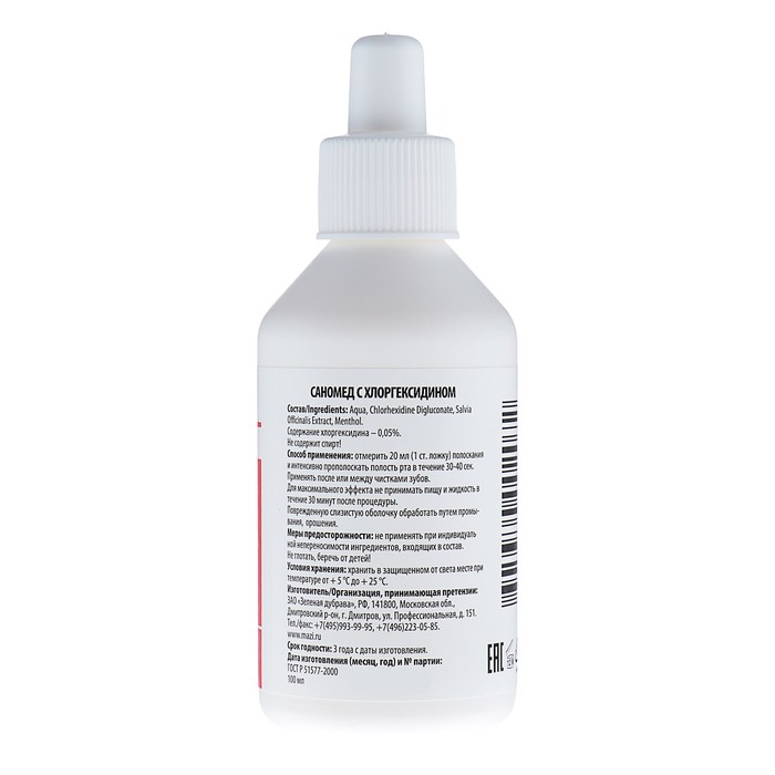 Полоскание для полости рта «Саномед» с хлоргексидином при воспалительных заболеваниях слизистой оболочки в полости рта. Сильное и эффективное средство, помогающее при острых воспалительных процессах в полости рта, когда удаляется больной зуб или вскрывается нарыв в воспалённой десне.