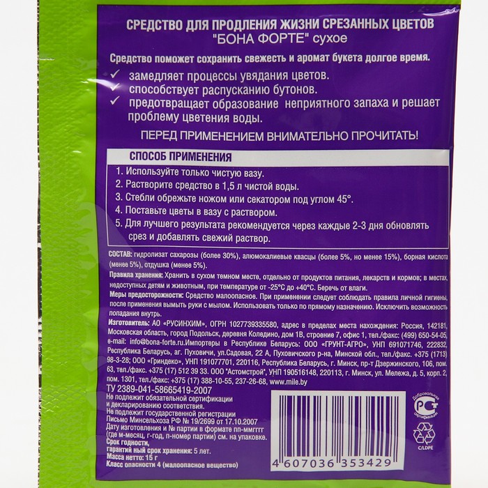 Средство значительно увеличивает продолжительность жизни почти всех срезанных цветов. Может использоваться для цветочных композиций в вазе или насыщения цветочной пены, дополняет и увеличивает восприятие качества букета.