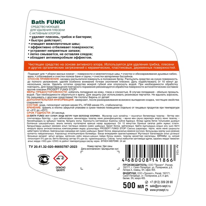 Средство для удаления плесени от Prosept – готовое к использованию средство на основе активного хлора для удаления очагов биопоражений. Используется для ликвидации грибковых поражений и органических загрязнений с керамических, пластиковых, деревянных поверхностей.