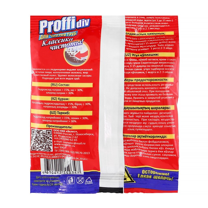 Способ применения: засыпать порошок в сливное отверстие, залить полстакана горячей воды, подождать от 3 до 5 мин и смыть большим количеством воды. Для профилактики рекомендуется применять средство 1 раз в месяц.