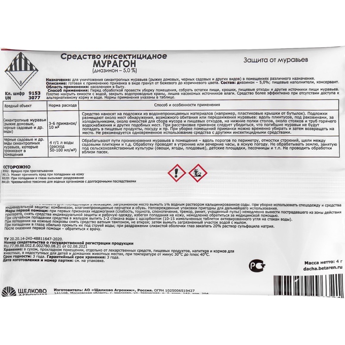 Мурагон – готовая к применению приманка в виде гранул для уничтожения синантропных муравьёв (рыжих домовых, чёрных садовых и других видов) в помещениях различного назначения. Препарат эффективен против широкого спектра вредных муравьёв, проявляет молниеносное действие, обладает слабым фумигантным действием, практически не имеет запаха. Состав: диазинон – 5,0%, пищевые наполнители, консервант.