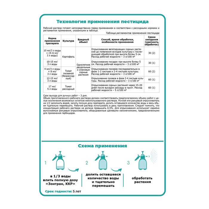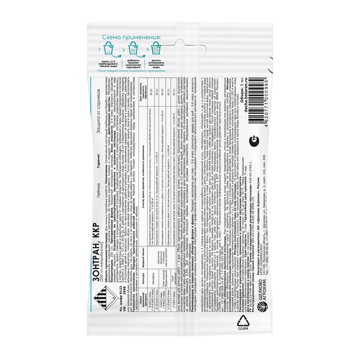 "Зонтран" представляет собой ампулу объемом 5 мл, содержащую активное вещество, способное быстро и эффективно уничтожить сорняки на картофеле и томатах. Данное средство обладает высокой степенью проникающей способности, что позволяет ему быстро проникать в растения и уничтожать сорняки на корневом уровне.