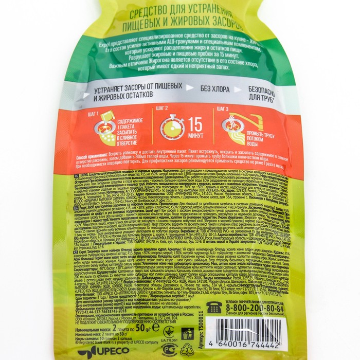 Способ применения: пакет встряхнуть, вскрыть и засыпать содержимое в сливное отверстие раковины затем добавить 200 мл теплой воды. Через 15 мин промыть трубу большим количеством воды. При необходимости операцию повторить. Для профилактики засоров рекомендуется применять средство не реже 1 раза в месяц.