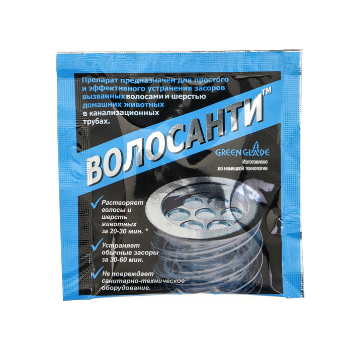 являются своеобразным каркасом для дальнейшего накопления жировых и солевых отложений. Под действием препарата «Волосанти» волосы растворяются полностью или разбиваются на небольшие фрагменты, которые затем легко смываются под напором воды. «Средство Волосанти» содержит в себе так же щелочные компоненты и функциональные добавки, которые действуют как обычные очистители канализационных систем, справляясь с бытовыми засорами.