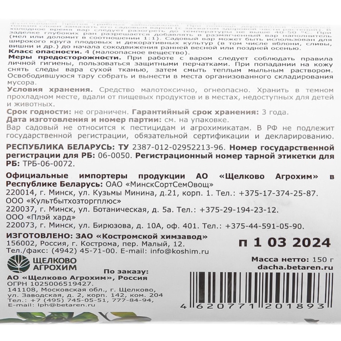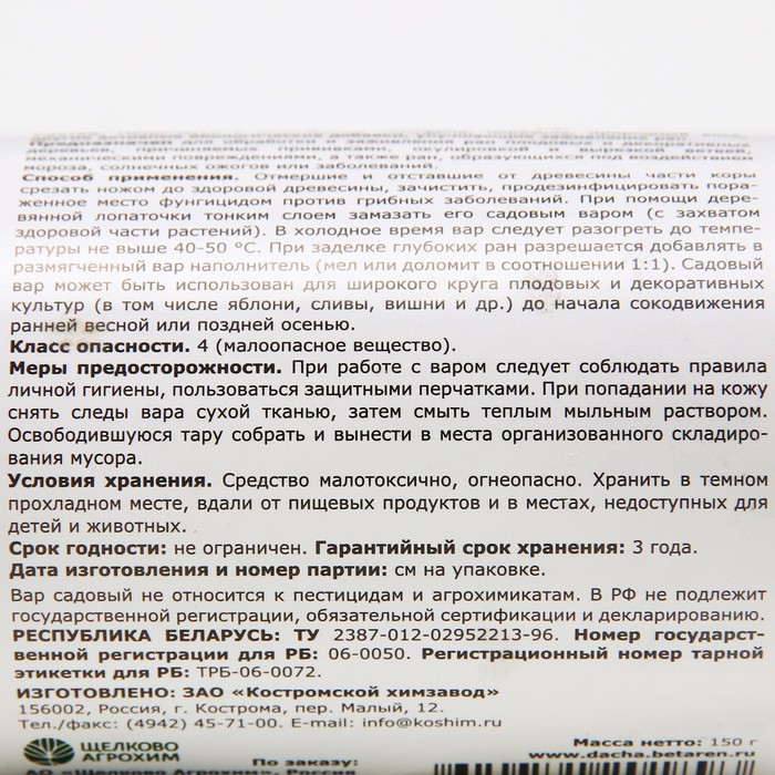 Садовый вар наносят на раны деревьев, чтобы защитить их от попадания патогенных микробов, грибков, паразитов и насекомых, а также от потерь древесного сока. Составом замазывают поврежденные участки не сразу, а спустя некоторое время, когда ранка слегка подсохнет. Ранки на стволах и ветках деревьев появляются по следующим причинам: