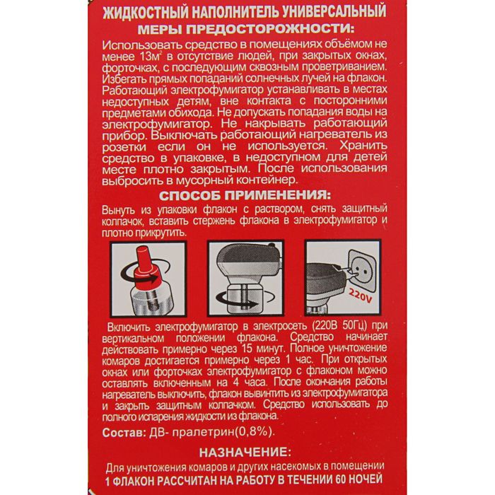Средство инсектицидное "Жидкость от комаров" универсальный, без запаха, красное, 60 ночей, 30 мл 2