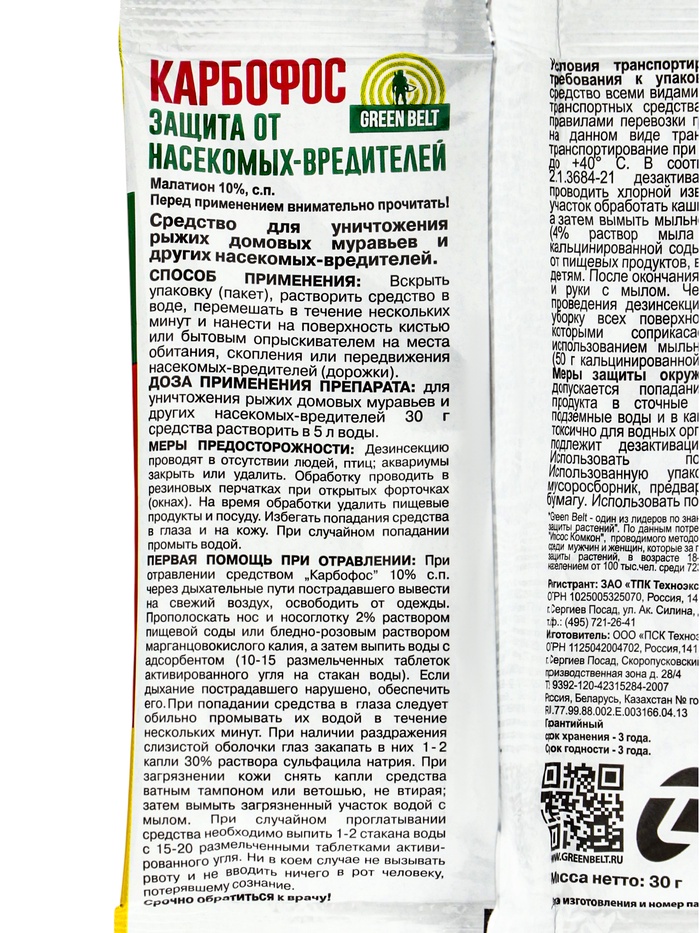 Карбофос (Малатион) – инсектицид, актуальность применения которого остаётся высокой и по сей день. Данное вещество может быть использовано человеком в домашних условиях, в сельском хозяйстве для борьбы со многими насекомыми-паразитами, в том числе и клопами. Карбофос против клопов эффективен на всех стадиях развития, начиная от яиц и заканчивая взрослыми особями. Надёжный, проверенный временем препарат.
