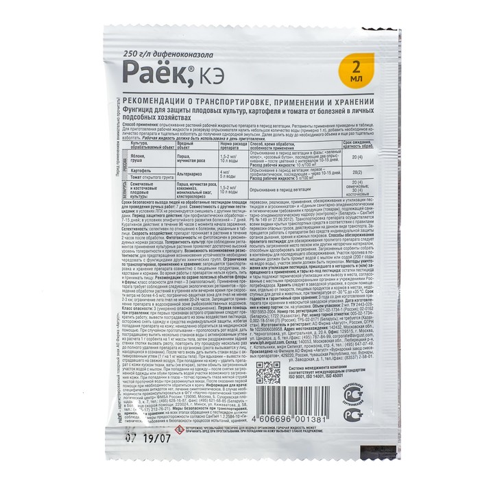 Способ применения: для приготовления рабочей жидкости расчётную дозировку препарата растворить в небольшом объёме воды и довести объем рабочего раствора до 10 л. Рабочую жидкость следует готовить непосредственно перед опрыскиванием и использовать полностью в тот же день. .