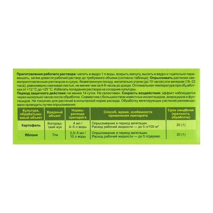 Приготовление рабочего раствора: налить в ведро 1 л воды, вскрыть ампулу, вылить в ведро и тщательно перемешать, затем довести рабочий раствор до требуемого объема (согласно таблице). Опрыскивать растения све- жеприготовленным раствором в сухую, безветренную погоду, желательно утром (до 10 часов) или вечером (18-22 часа), равномерно смачивая листья, не менее чем за 4-6 часов до дождя. Оптимальная температура при обработ- кахот +12 °С до +25°С. Избегать попадания раствора на соседние культуры.