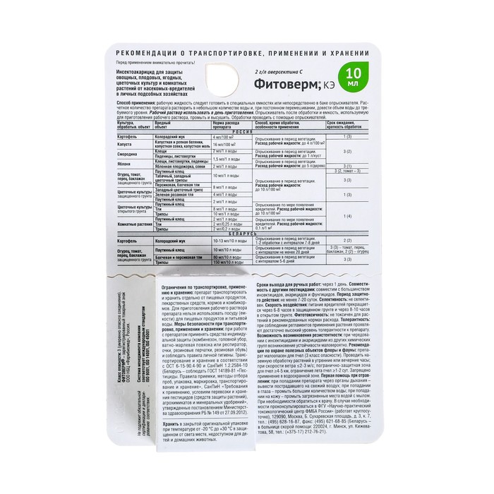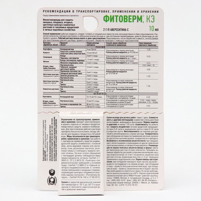 «Фитоверм» — незаменимый препарат для защиты растений от вредителей в период, когда до сбора урожая осталось совсем мало времени. Уничтожает листогрызущих и сосущих насекомых-вредителей: плодожорок, совок, листоверток, белянок, пядениц, тлей, трипсов, паутинного клеща.