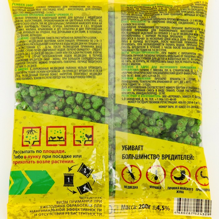 Рембек Гранула от медведки– высокоэффективное средство для защиты сельскохозяйственных культур от медведки и проволочника с особо привлекательным для вредителей вкусом и запахом. Обладает 100% эффектом уничтожения насекомых, их яиц и личинок.
