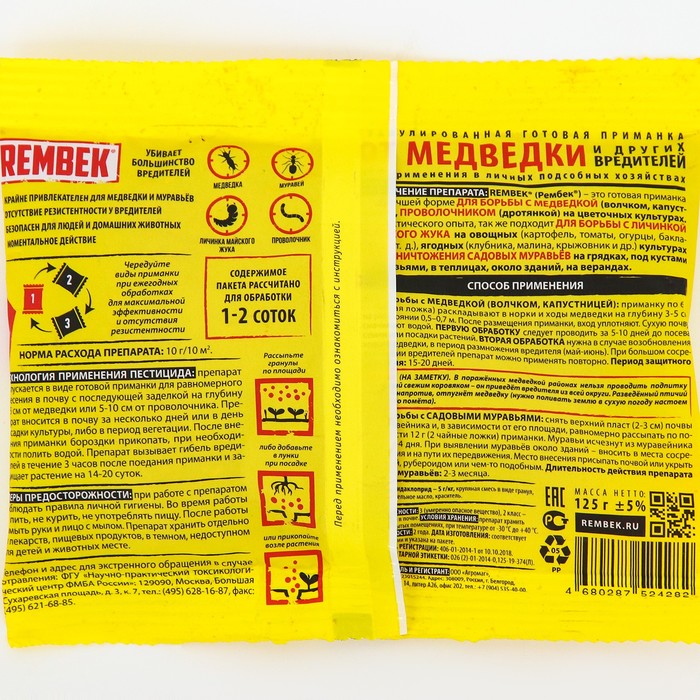 ОПИСАНИЕСредство от медведки Рембек микрогранула - высокоэффективное средство для защиты сельскохозяйственных культур от медведки и проволочника с особо привлекательным для вредителей вкусом и запахом. Обладает 100% эффектом уничтожения насекомых, их яиц и личинок. Данная форма препарата, за счет мелкой фракции, позволяет обработать большую площадь, по сравнению с другими видами.ПРЕИМУЩЕСТВАСостав приманки безотказно действует на вкусовые рецепторы вредителя.Сразу готова к применению и не требует никакого приготовленияОчень широкий спектр действия на различные виды вредителей.Период защитного действия составляет 10-14 днейДействует не только на вредителей, но также на их яйца и личинкиСОСТАВДействующее вещество Имидаклоприд 5 г/кг.СПОСОБ ПРИМЕНЕНИЯПрепарат полностью готов к применению, и после вскрытия упаковки, достаточно дозированно обработать почву согласно инструкции. Первую обработку проводить за 5-10 дней до посева или посадки растений, вторую ― в случае появления ходов медведки, в период их размножения (май, июнь). Для борьбы с медведкой приманку по 2-4 г ( 0,5 чайной ложки), разложить в норки и в ходы медведки на глубину 3-5 см на расстоянии 0,5-0,7 м, после чего вход уплотнить. Если почва сухая, промочить водой.СРОК ГОДНОСТИ И ХРАНЕНИЯСрок годности 36 месяцев. Хранить в сухом, не доступном для детей и животных месте.УПАКОВКАСредство расфасовано в пакеты по 125г.ХарактеристикиПодкатегория товараот медведкиПроизводительАгроМагБонусные баллы0КолВУп100Тизервысокоэффективное средство для защиты сельскохозяйственных культур от медведки и проволочника