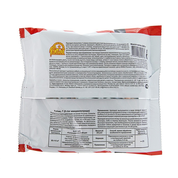 «Рубеж», особенность действующего вещества этого препарата в том, что риск возникновения резистентности (устойчивости) вредителей минимален. Препарат выпускается в виде готовой приманки для равномерного внесения в почву с последующей заделкой.