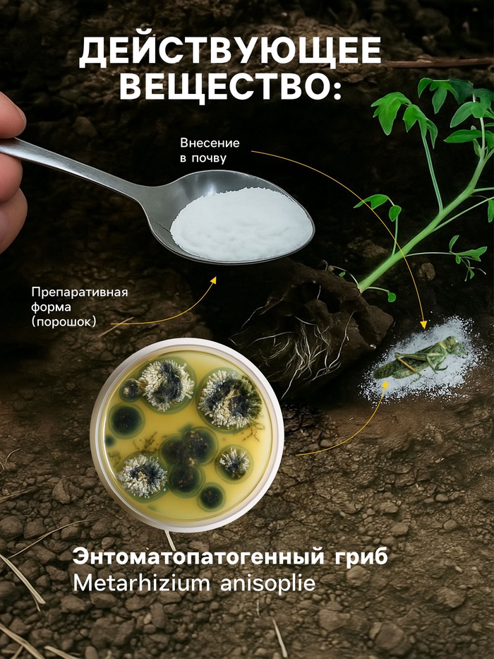 Метаризин — уникальный биологический инсектоакарицид на основе гриба Metarhizium от почвообитающих вредителей (медведки, проволочника, клеща, личинок майского жука и многих других. Действующее вещество: природные штаммы гриба Метаризиум (Metarhizium anisopliae).Способ воздействия: контактно-кишечный.Химический класс: энтомопатогенных грибов.Споры Metarhizium вызывают заболевания и гибель насекомых, тем самым снижают популяцию вредителей:почвообитающих насекомых ( проволочников; медведок; майских жуков (хрущей) и их личинок; подгрызающих совок и др)зимующих или проходящих одну из стадий своего развития в почве или на поверхности почвы: клещей (паутинного, земляничного и др.); листоеда (земляничного, крыжовникового); колорадского жука; долгоносика; огневки; пилильщика; клопа крестоцветного; мухи (морковной, луковой, капустной); крымского и турецкого скосаря; галлицы (смородиновой, яблонной) и множества других насекомых – вредителей).Инструкция по применению:Внесение в почву в сухом виде:50-100г на сотку / 15-20г на кустарник, дерево;Пролив почвы: 50г на 30-50л поливной воды;Санация почвы (весенняя и осенняя обработка): 100-150г на сотку.