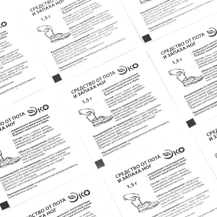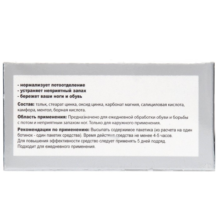 Способ применения: высыпать содержимое пакетика из расчета 1 пакетик в 1 ботинок.