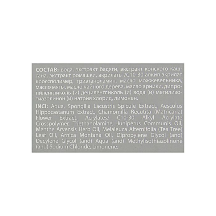 Оно обладает антисептическим и успокаивающим действием. Содержит экстракты ромашки и конского каштана, эфирные масла чайного дерева, можжевельника, мяты и арники. Всё это помогает укрепить стенки кровеносных сосудов и капилляров, уменьшить отёки и способствует рассасыванию гематом.