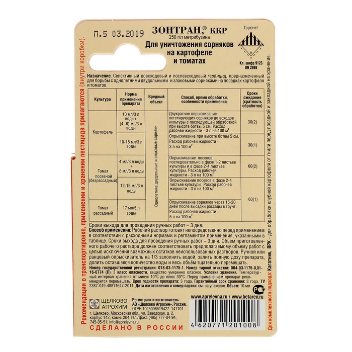 Препаративная форма – концентрат коллоидного раствора – обеспечивает быстрое проникновение метрибузина в растение и хорошую адгезию препарата на листе. За счет этого достигается высокая биологическая эффективность при меньшем расходе метрибузина.