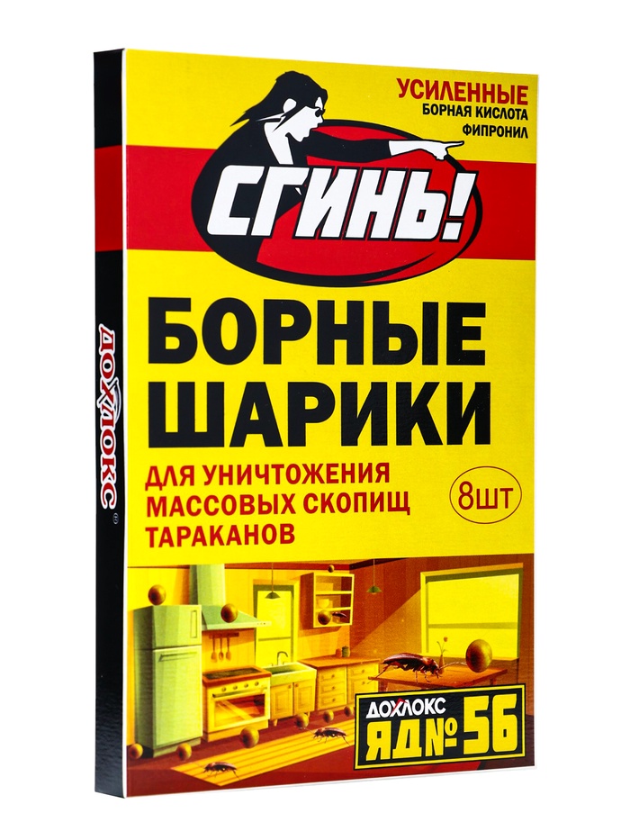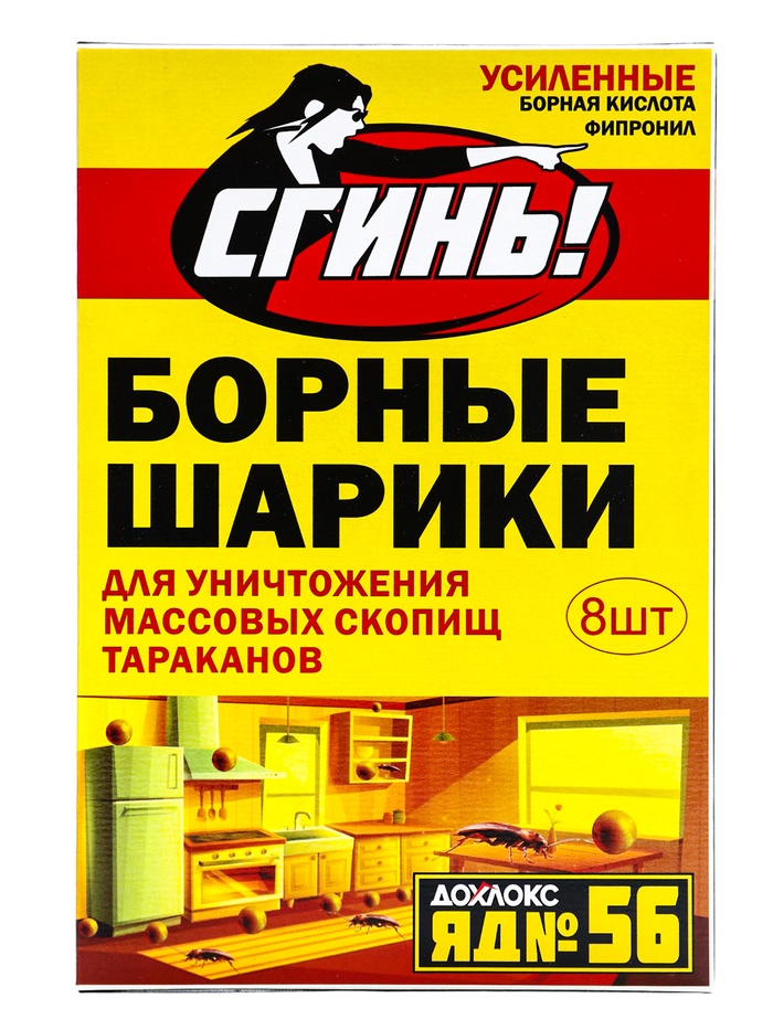 ОписаниеБОРНЫЕ ШАРИКИ «СГИНЬ!». Усиленные №56 для уничтожения массовых скопищ тараканов в квартирах ( 8 штук в упаковке) это самое известное народное средство от тараканов. В его состав входит настоящая борная кислота и фирменная пищевая приманка с ядом Дохлокс №56. Так что теперь это старое испытанное средство по уничтожению тараканов стало еще более эффективным и безотказным.Шарики следует вынуть из упаковки и разместить в местах появления и передвижения тараканов. Обычно располагать шарики следует на расстоянии примерно 1 метр друг от друга. При большой численности насекомых промежутки между шариками следует уменьшить до 30-50 см. Желательно не помещать в пыльные места. Не допускать контакта с маленькими детьми и домашними животными. После работы вымыть руки с мылом.СоставБорная кислота - 12%, фипронил - 0,05%, техкомпоненты - 87,95%.