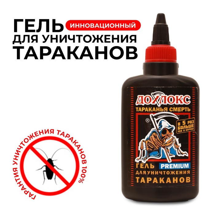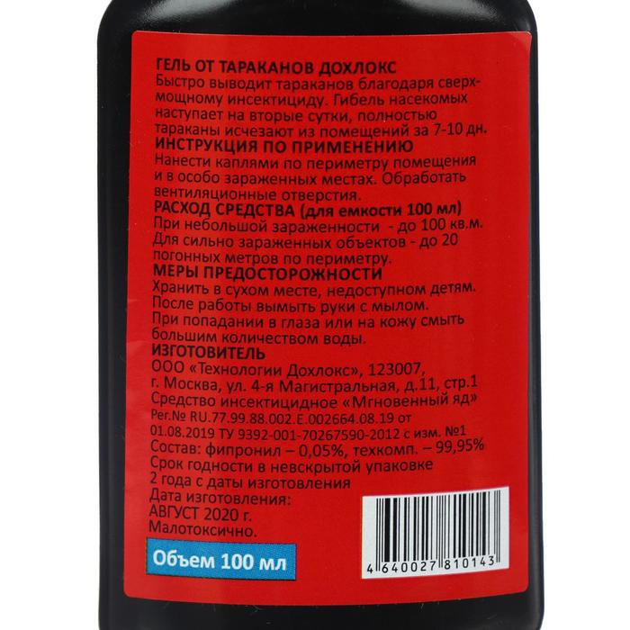 Дохлокс мгновенный яд – гель от тараканов. Позволяет очень быстро избавиться от тараканов благодаря уникальному химическому составу, содержащему сверхсильный инсектицид в повышенных концентрациях. Гибель насекомых наступает уже в первые сутки после применения. Основная масса погибает на вторые-третьи сутки, а полностью тараканы исчезают из помещений за 5-7 дней.СОСТАВФипронил - 0.06%, Техкомпоненты - 99,94%ИспользованиеАккуратно выдавливать гель, нанося его небольшими полосками по периметру помещения: вдоль плинтусов, стен, щелей. Особое внимание уделить обработке вентиляционных отверстий. Нанести побольше геля на пол под мойками, батареями отопления, кухонными шкафами м в санузлах.Если тараканов немного и они только появились:1 уп на 45 кв.м.Если тараканов очень много: 1 уп на 3 кв.м.
