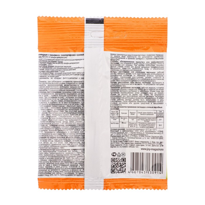 Действующее вещество: Альфа-циперметрин 100 г/л Обладает отпугивающим эффектом и длительным периодом защитного действияПериод защитного действия: 7 сутокСкорость воздействия:Проникает в растения через листья в течение первых часов после опрыскивания, обеспечивает быстрое уничтожение вредителей.Способ применения:В ведре или любой другой емкости расчетное количество препарата растворите в небольшом объеме воды при постоянном перемешивании;Затем долейте воду до нужного объема (из расчета на дерево или 100 кв.м);Раствор должен быть использован в день приготовления.Применение для картофеля: 1мл/ 5л воды/ 100 кв.м.Применение для яблони: 3мл/ 10л воды.