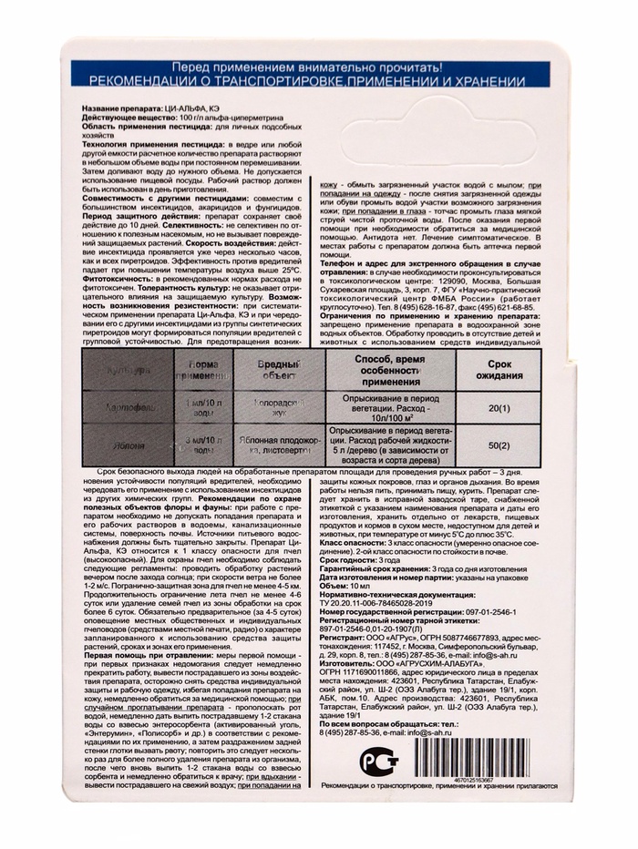Рекомендации по применению: Препарат используют при первых признаках появления вредителей. Рабочий раствор готовят непосредственно перед обработкой. «Ци-Альфа» в компактном флаконе 10 мл — оптимальное решение для защиты растений на дачных участках и небольших фермерских хозяйствах.