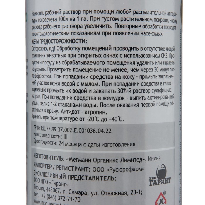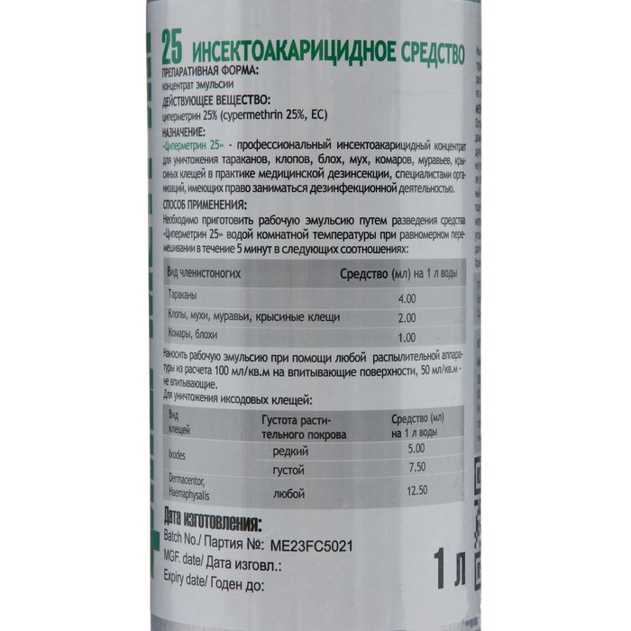 Способ применения: Для проведения обработки необходимо приготовить рабочую эмульсию путем разведения средства «Циперметрин 25» водой комнатной температуры при равномерном перемешивании в течение 5 минут. Наносить рабочий раствор при помощи любой распылительной аппаратуры в места обнаружения, локализации и перемещения членистоногих из расчета 100 мл/м кв на впитывающие поверхности, 50 мл/м кв – на невпитывающие. Убирают средство с обработанных рабочих поверхностей влажным способом не менее чем через 8 часов после обработки, но не позднее, чем за 3 часа до планируемого доступа людей в помещение.