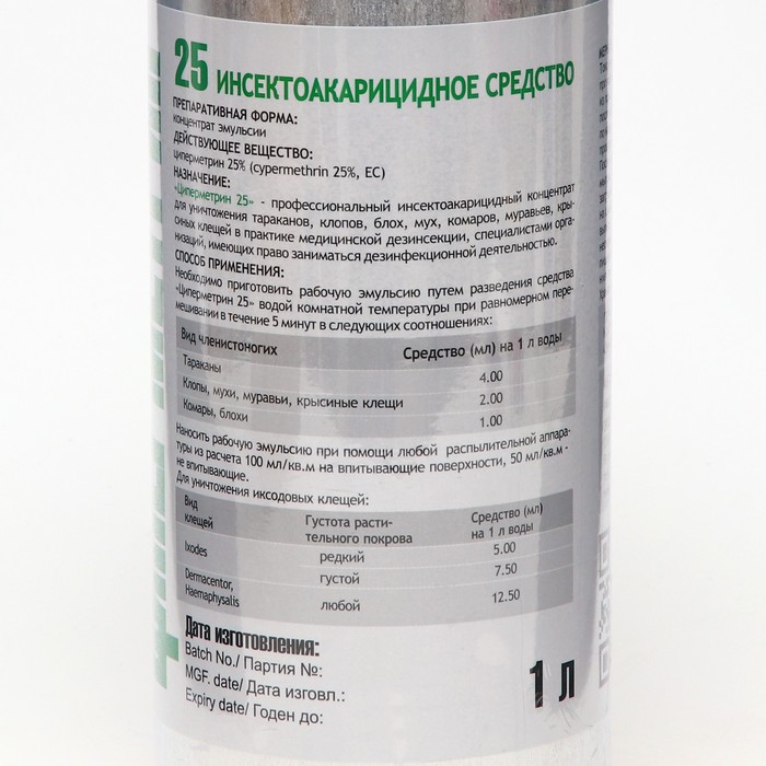 Профессиональный инсектоакарицидный концентрат «Циперметрин 25» предназначен для уничтожения тараканов, клопов, блох, мух, комаров, муравьев и крысиных клещей на объектах различных категорий, а также для борьбы с иксодовыми клещами при обработке природных стаций.