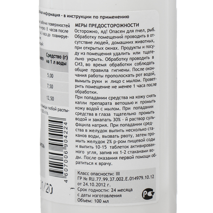 Меры предосторожности: Осторожно яд! Опасен для пчел, рыб. Обработку помещений проводить при отсутствии людей, домашних животных, при открытых окнах. Продукты и посуду из помещения убрать или тщательно укрыть. После окончания работы рот прополоскать водой, вымыть руки и лицо с мылом. Обработку проводить в СИЗ, во время обработки соблюдать общие правила гигиены.