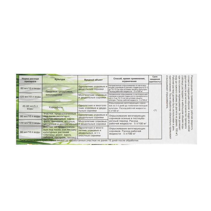 - Плодовые, цитрусовые культуры, виноградники - направленное опрыскивание вегетирующих сорняков в ранние стадии роста от 5 до 10-15 см при условии защиты культуры. Расход – 5 л/100 м².