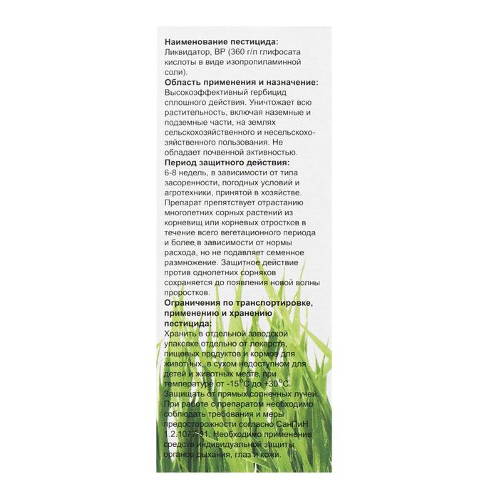 - Участки, не предназначенные под посев или посадку культурных растений (обочины дорог, вдоль заборов, построек, теплиц) - опрыскивание вегетирующих сорняков. Расход – 5 л/100 м².