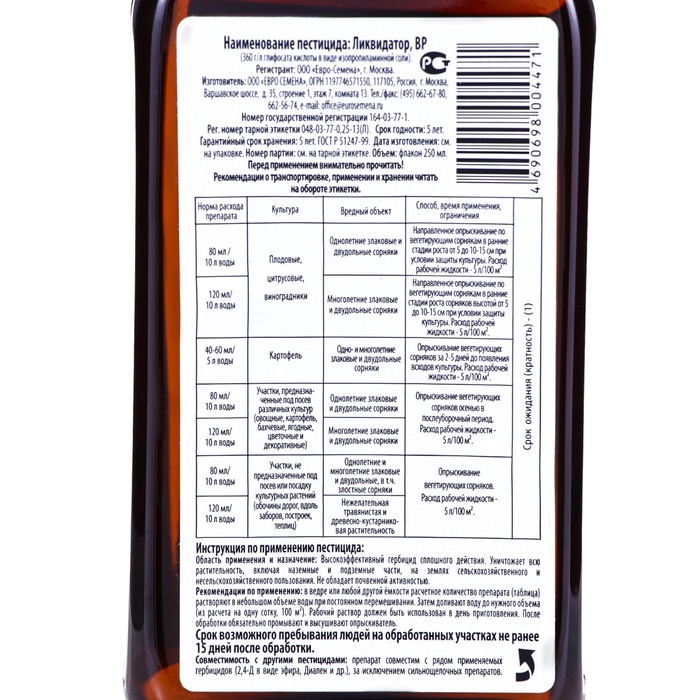 Средство «Ликвидатор» уничтожает всю растительность, включая наземные и подземные части на землях сельскохозяйственного и несельскохозяйственного пользования. Не обладает почвенной активностью.