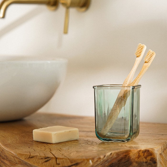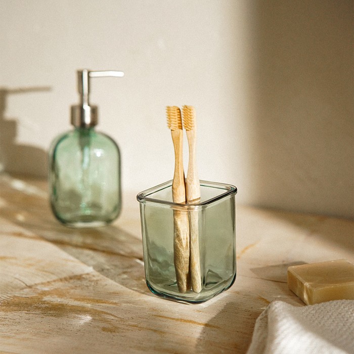 Выполненный из прочного стекла, этот стакан отличается строгой квадратной формой и прозрачным дизайном, который легко вписывается в любой интерьер ванной комнаты. Его габариты — 8x8x10,4 см — идеально подходят для компактного размещения на раковине или полочке, не занимая лишнего пространства.
