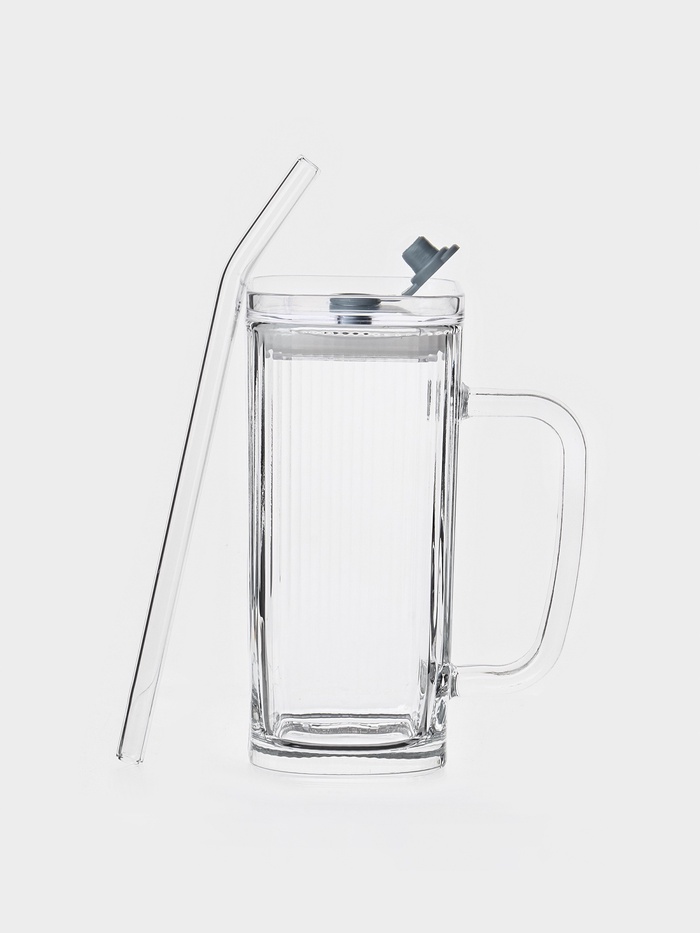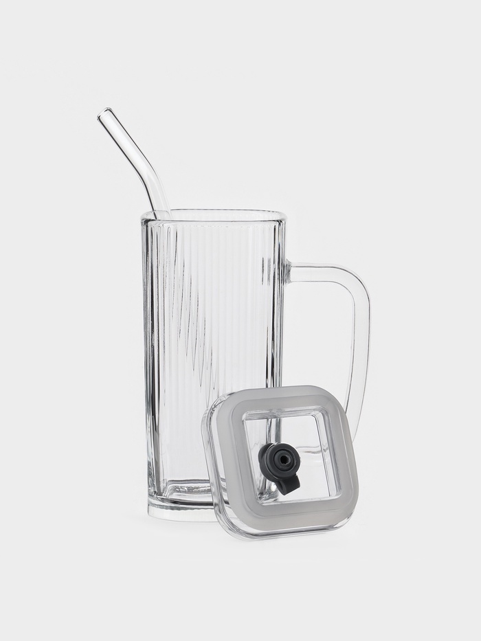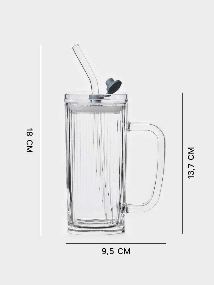 Изготовленный из прозрачного стекла с рельефной текстурой, этот стакан не только привлекает внимание, но и обеспечивает удобство в использовании. Крышка и трубочка делают его идеальным для активного образа жизни, позволяя наслаждаться любимыми напитками в любом месте.