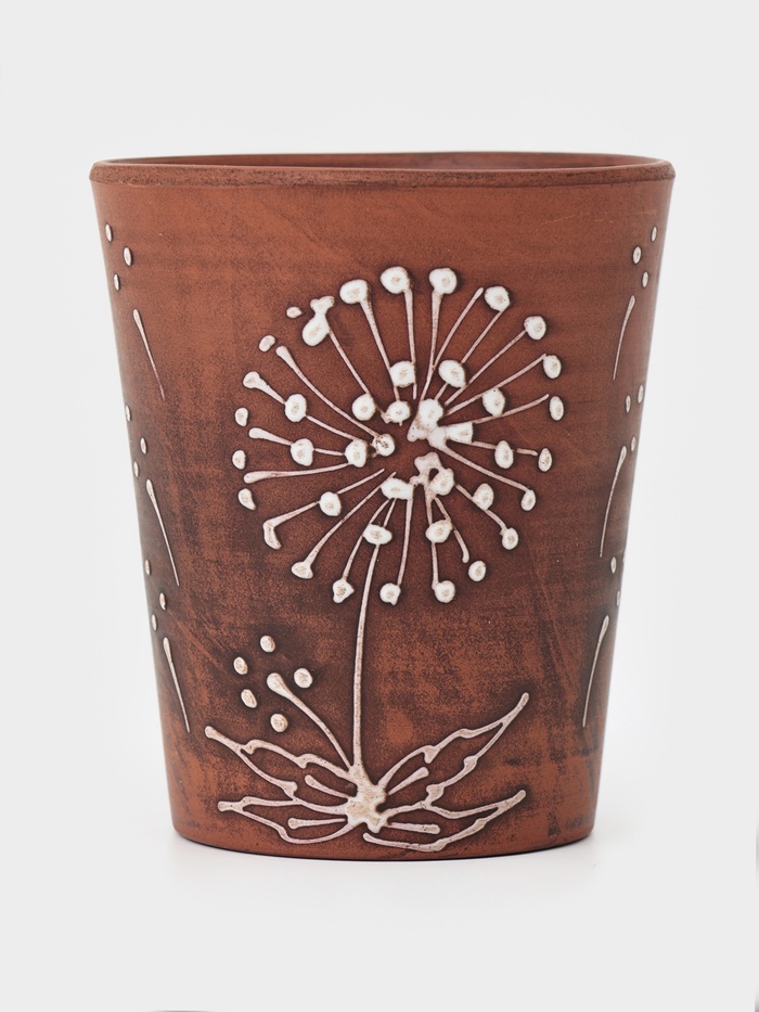 Стакан «Одуванчик» из красной глины объемом 400 мл — это гармоничное сочетание натурального материала, удобной формы и выразительного декоративного оформления. Изящный растительный узор придает изделию особый характер, делая его не только практичным, но и эстетически привлекательным элементом сервировки.