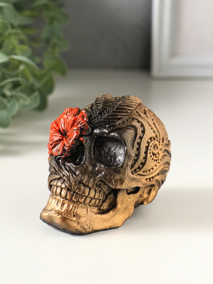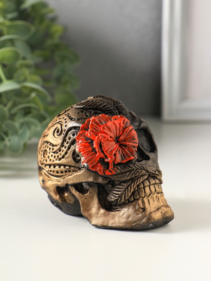 Статуэтка "Череп с цветком" размер 8х7х6 см, цвет бронза с алым цветком