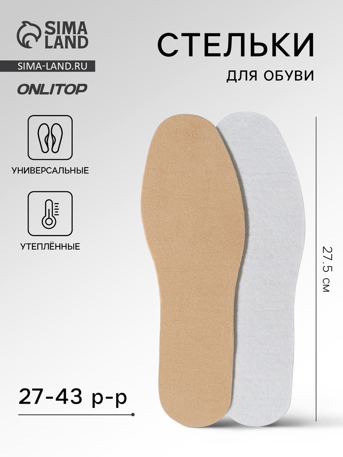 Стельки для обуви, утеплённые, универсальные, р-р RU до 43 (р-р Пр-ля до 45), 27,5 см, пара, цвет белый
