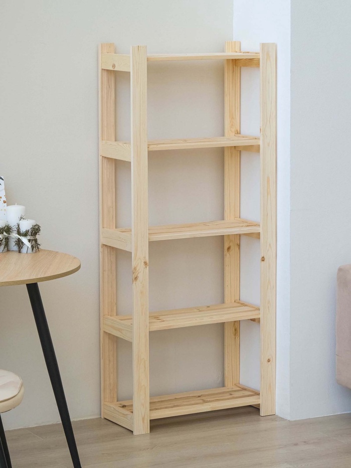 Открытый компактный стеллаж, сделанный из массива хвои, самый бюджетный в нашей серии. Он станет полезной частью гостиной, спальни, детской комнаты, квартиры-студии или офисных помещений.