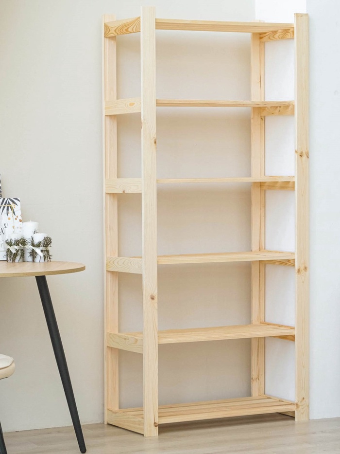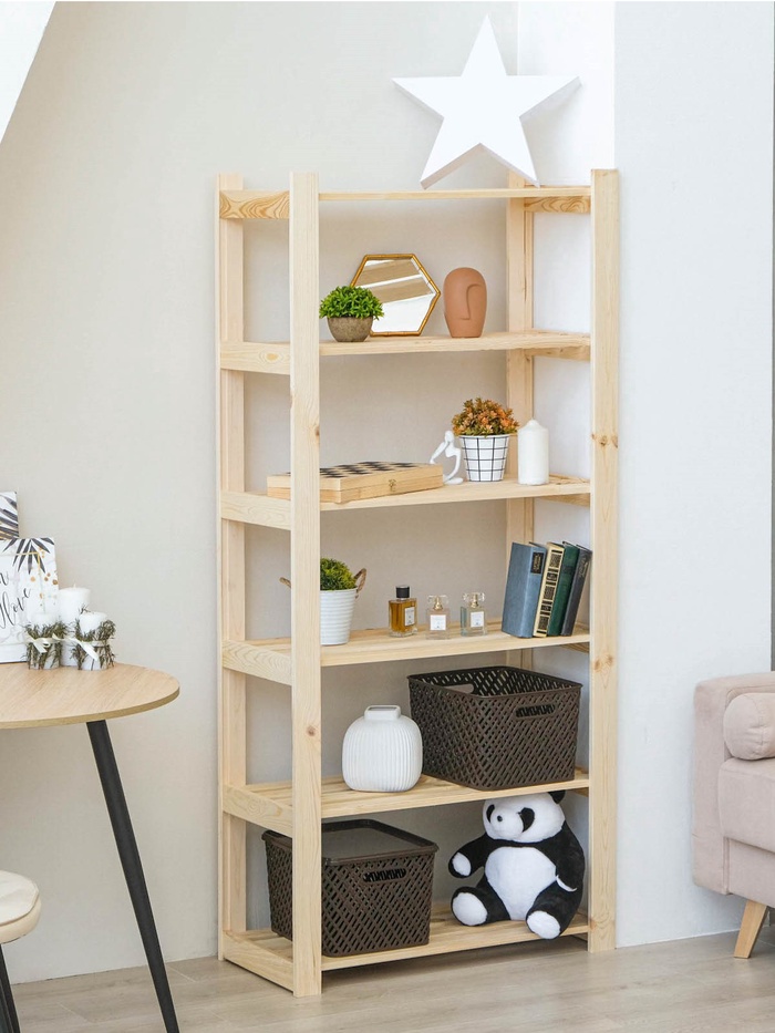 Открытый компактный стеллаж, сделанный из массива хвои, самый бюджетный в нашей серии. Он станет полезной частью гостиной, спальни, детской комнаты, квартиры-студии или офисных помещений.