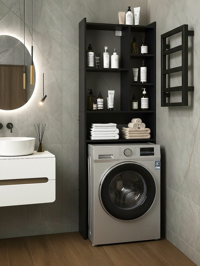 - Над стиральной машиной: хранение порошков, средств для стирки, корзин
