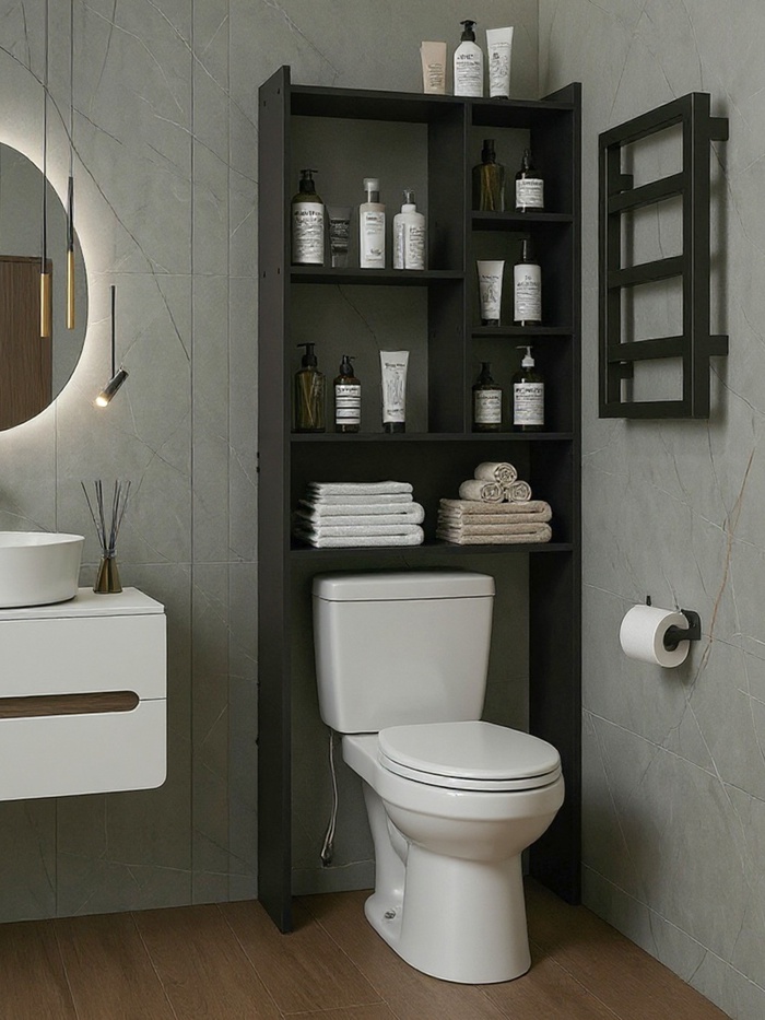 - Над унитазом: удобное размещение бумаги, полотенец, средств для уборки