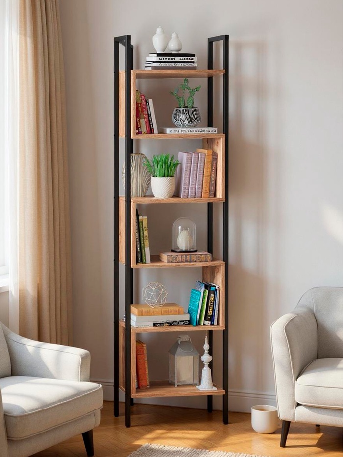 - Использование в качестве разделителя пространства: применяйте стеллаж как перегородку между зонами отдыха и рабочей зоной, зрительно расширяя пространство.