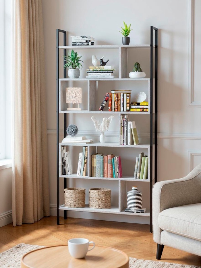 - Использование в качестве разделителя пространства: применяйте стеллаж как перегородку между зонами отдыха и рабочей зоной, зрительно расширяя пространство.