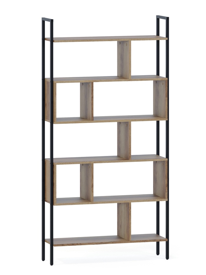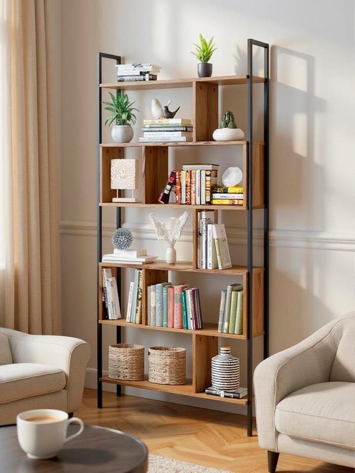 - Использование в качестве разделителя пространства: применяйте стеллаж как перегородку между зонами отдыха и рабочей зоной, зрительно расширяя пространство.