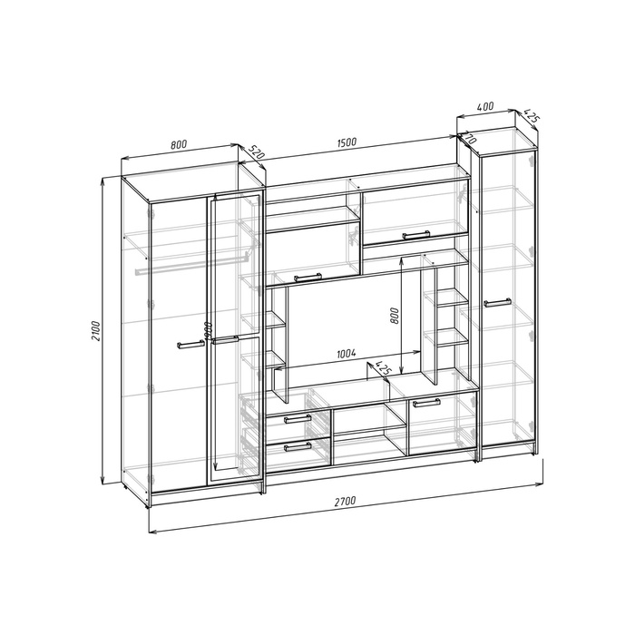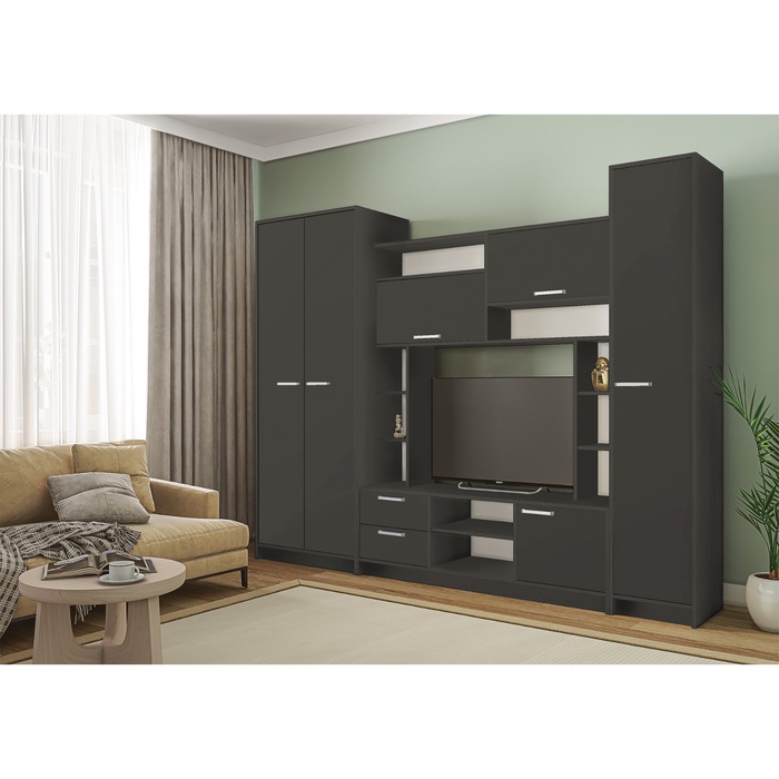 Гостиная «Марта» – практичный вариант для обустройства вашего дома, который способен привести в восторг тех, кто обладает безупречным вкусом и взглядом на эстетику. Шкаф имеет абсолютно всё, что необходимо для грамотного оформления гостиной комнаты. У него есть крупный отдел со штангой, предназначенным для хранения одежды на вешалках. Также конструкция имеет множество открытых и закрытых полок, выдвижные ящики. Они созданы как для хранения техники, аксессуаров и других вещей, так и для украшения декором.