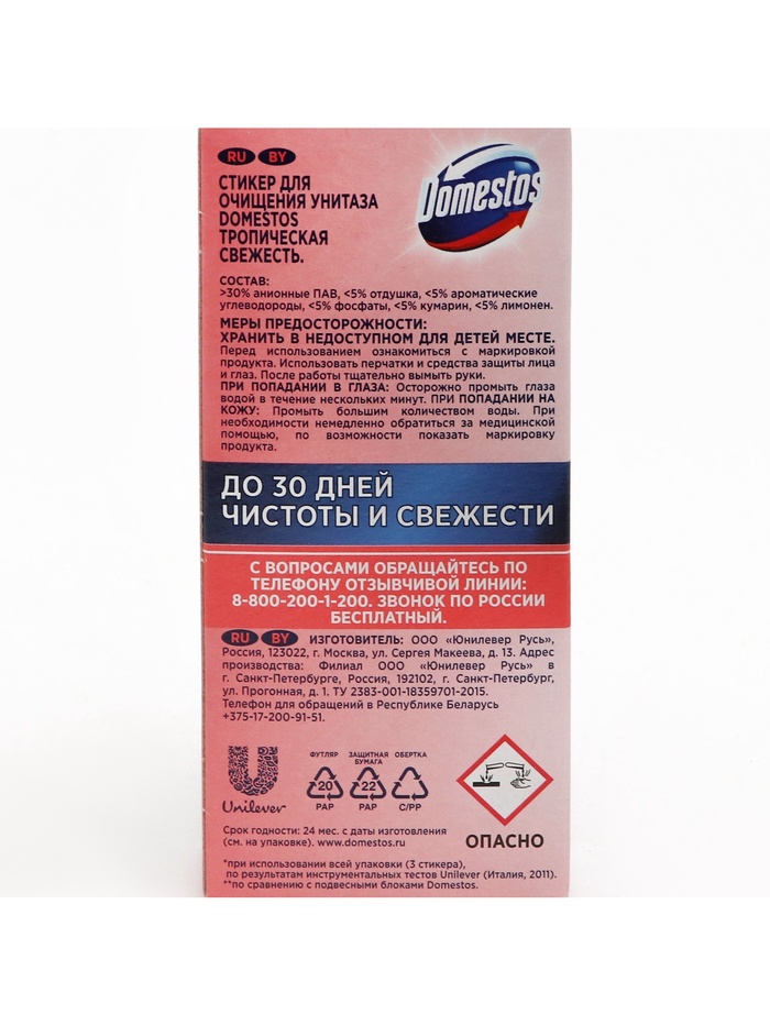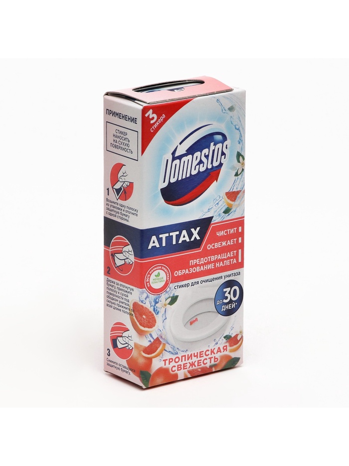 Стикеры для очищения унитаза аромат - тропическая свежесть. Существует множество помощников в быту, которые ликвидируют грязь и опасных бактерий, прочищают канализационные трубы, помогают в мытье полов и посуды, а также улучшают внешний вид вашей сантехники. Стикеры применяются для очищения унитаза, поддерживают чистоту и запах свежести при каждом спуске воды. Стикеры легко и надёжно клеятся на поверхность унитаза, не оставляя следов после использования. Специальная формула средства обеспечивает его экономичность: упаковки из 3 стикеров хватает до 450 спусков воды.