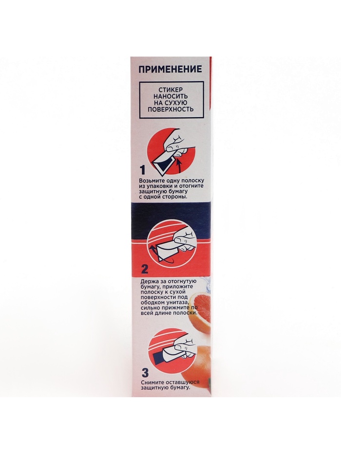 Способ применения: стикер наносить на сухую поверхность. Возьмите одну полоску из упаковки и отогните защитную бумагу с одной стороны. Держа за отогнутую бумагу, приложите полоску к сухой поверхности под ободком унитаза, сильно прижмите по всей длине полоски. Снимите оставшуюся защитную бумагу.